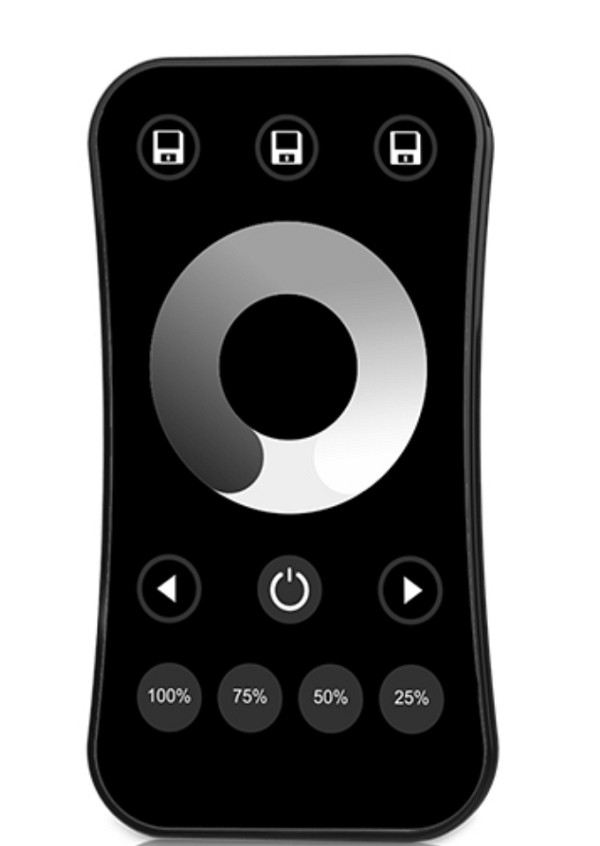 Ergonomische 1 zone afstandsbediening voor standaard LEDS (120 LEDS/M of 240 LEDS/M) 12/24V. Werkt ook op alle led spots. Kan zowel gebruikt worden om te schakelen (aan/uit) als om te dimmen. Draad- loos gestuurd. Werkt tot op 30m. Incl ontvanger. Vermogen ontvanger 8,5A. Voorzien van handige wandhouder (meegeleverd)